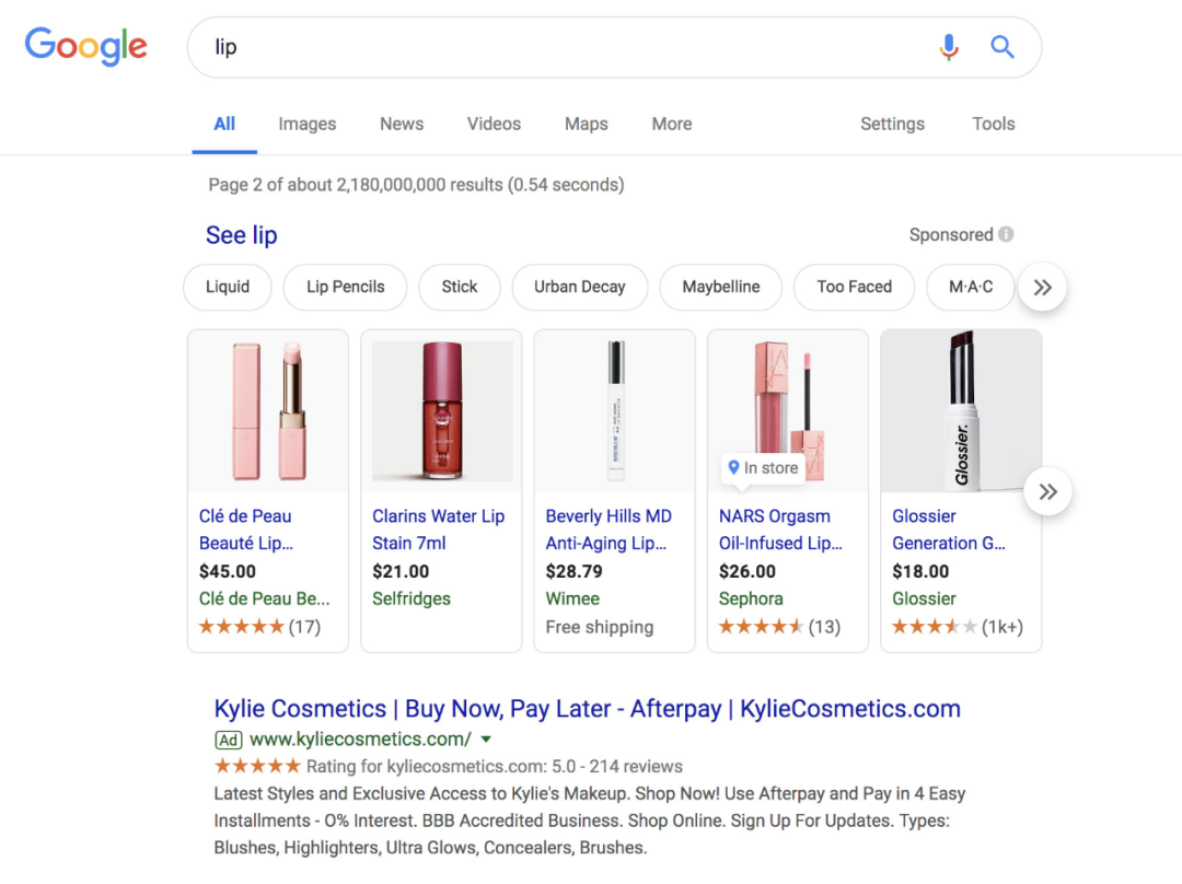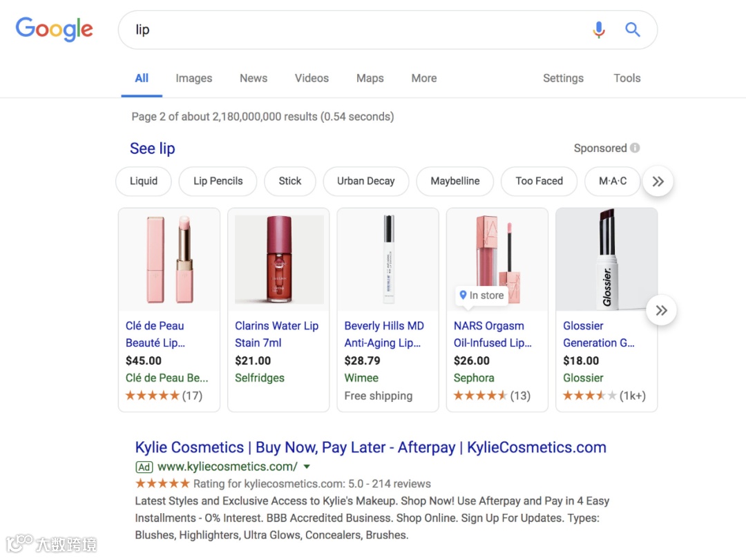 简单来说,当你在Google上搜索 Lip 的时候,出来的结果排名越上,代表网站的内容与你搜索的关键词越接近。我们可以采取SEO(搜索引擎优化)的方式提升在搜索引擎上的排名,当然也可以直接通过Paid Search进行竞价排名。一般是以Pay Per Click(PPC)的方式进行付费,即只有当用户点击了该条链接的时候,才会收取一定的费用。