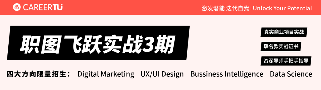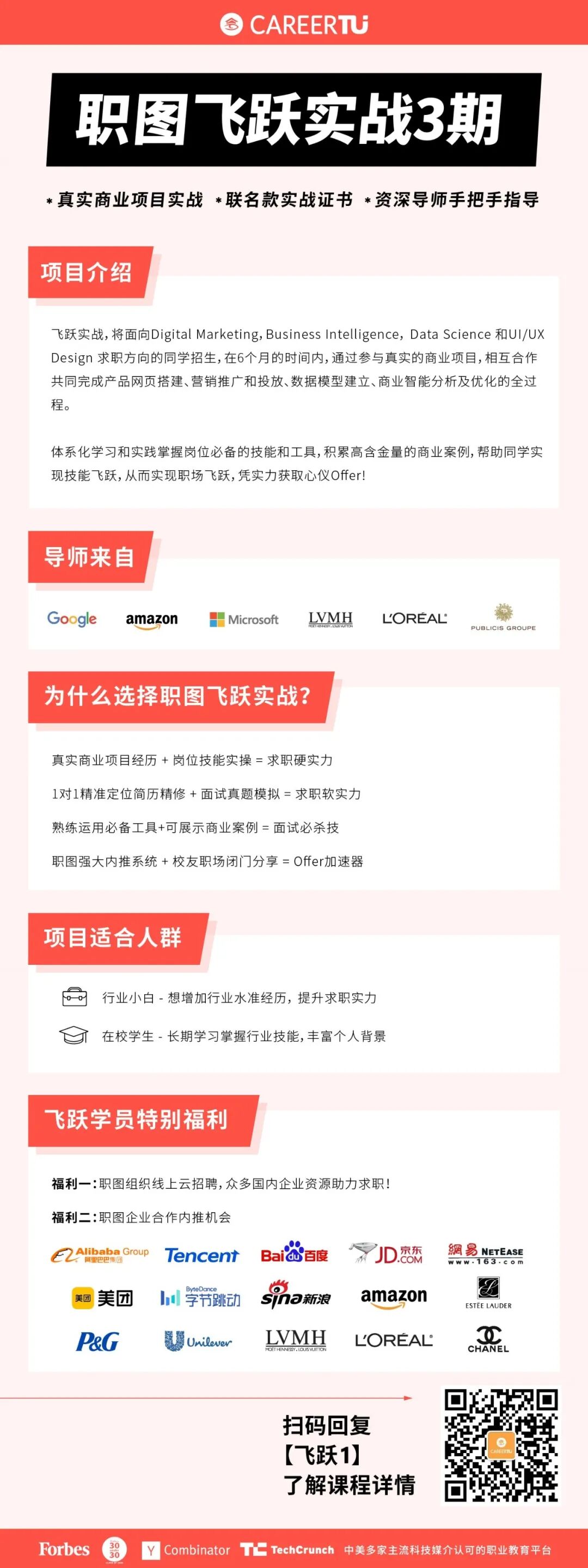 职图今年推出的飞跃计划,面向Digital Marketing、Product Design、Business Intelligence和Data Science四个求职方向的同学招生!