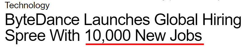 在硅谷缩招、裁员大潮之下,有一家科技公司却宣布疫情期间全球扩招10000人,这就是字节跳动!字节跳动宣布2020年计划创造40000个新岗位,招完这波之后,员工人数将和阿里巴巴相当了。
