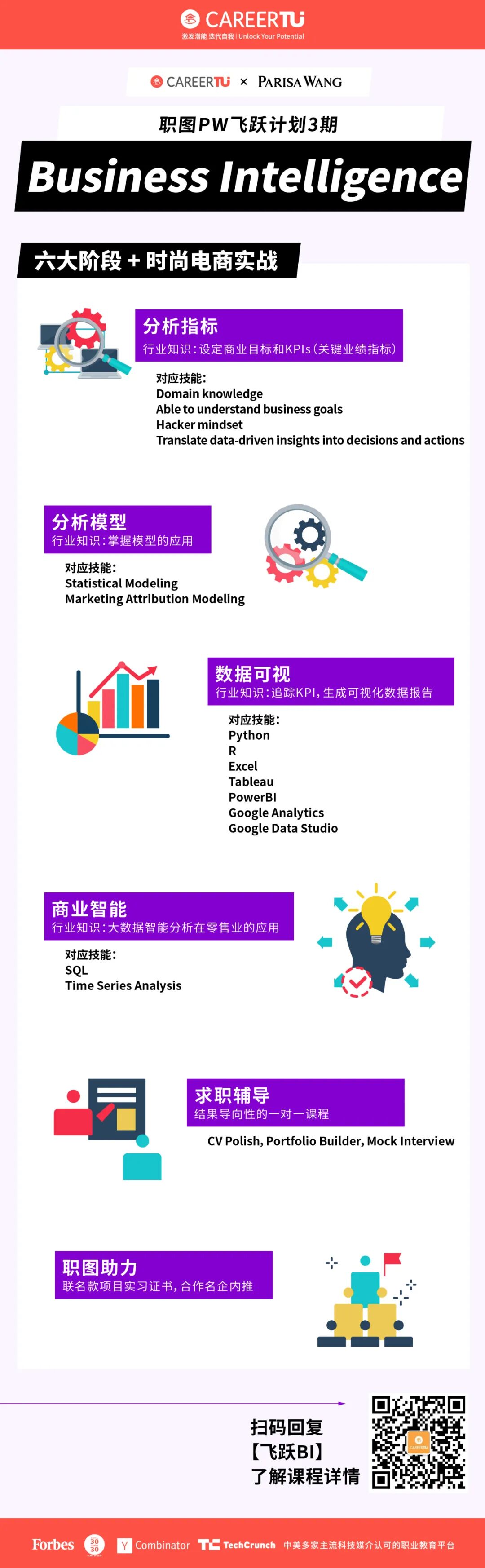 职图飞跃计划,面向Digital Marketing、UIUX Design和Business Intelligence,Data Science四个求职方向的同学招生!参加计划的学员在6个月的时间内,通过参与真实的商业项目,相互合作共同完成职图×Parisa Wang联名款产品网页搭建、营销推广和投放、商业智能分析及数据分析、优化的全过程。