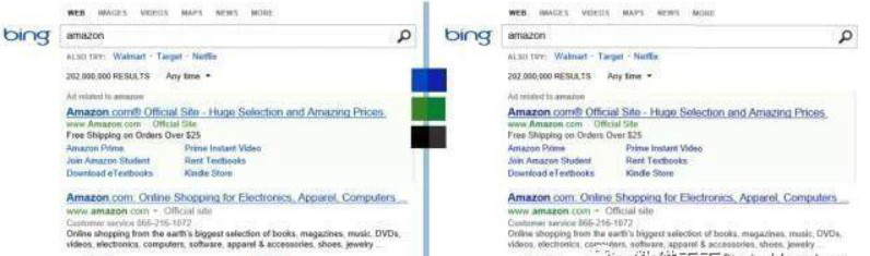 “纳尼?两个方案看着没啥区别呀” 带着这样的内心OS开启了“找不同游戏“模式,是不是你本人了?职图小编公布答案喽:区别在于颜色!左侧页面中,搜索结果标题的蓝色比较浅,右侧页面中更深一些。恰恰是这肉眼几乎分辨不出的细微变化,在实际应用中,为微软公司带来了千万美元量级的收入提升!