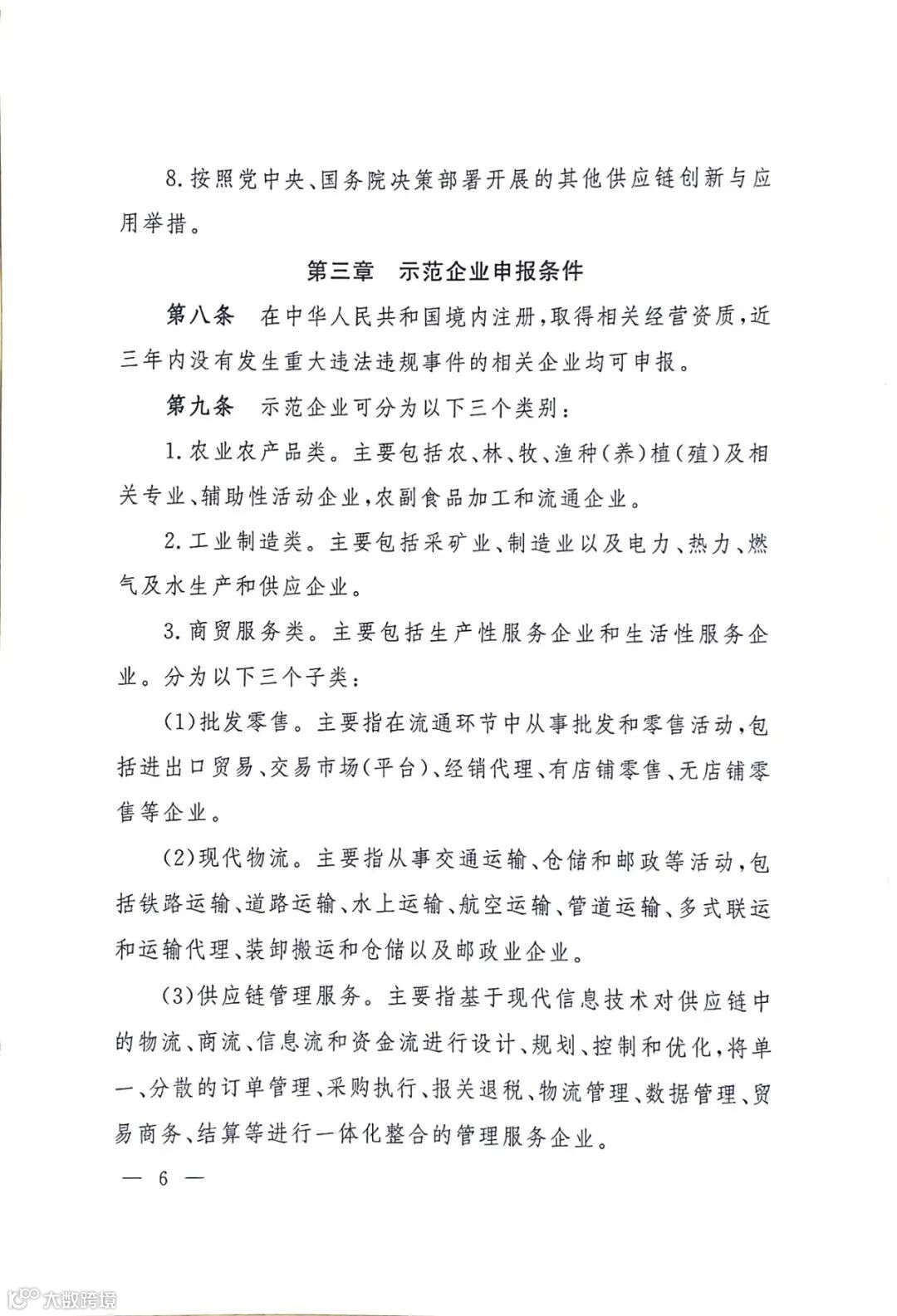为深入贯彻党中央、国务院关于提升产业链供应链现代化水平,维护产业链供应链安全稳定的决策部署,进一步落实《国务院办公厅关于积极推进供应链创新与应用的指导意见》(国办发[2017]84号),切实做好全国供应链创新与应用示范创建工作,规范示范创建过程中的组织申报、评审认定、过程管理、绩效评估等,商务部等8单位共同制定了《全国供应链创新与应用示范创建工作规范》(以下简称《工作规范》)。
