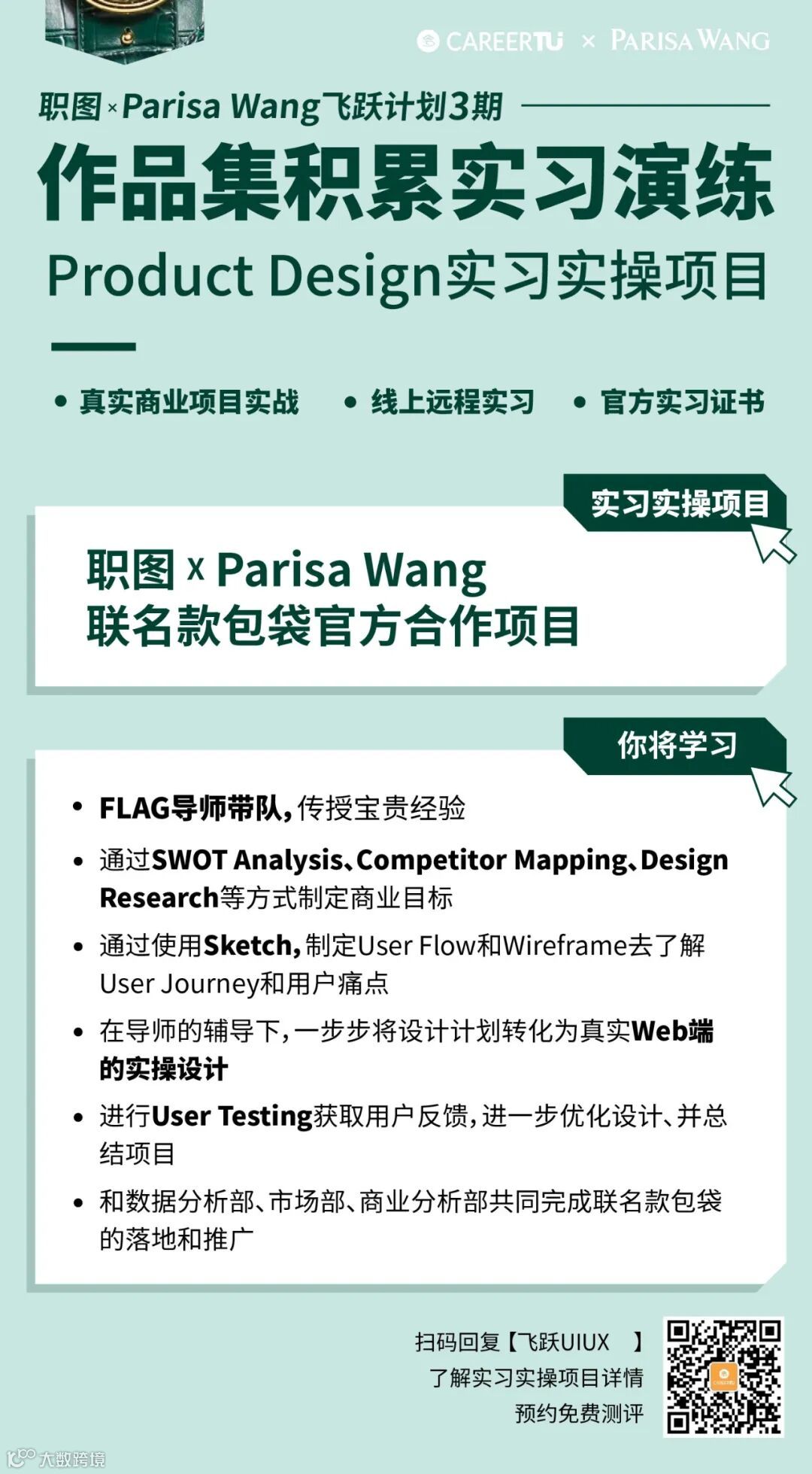 职图x Parisa Wang飞跃计划将由Google/Amazon等大厂导师带队,针对同学的薄弱点,重点提升Product Designer必备技能和求职软实力,同时,这份真操实练的商业项目让你在家就能打造一份属于自己的高含金量商业设计作品!
