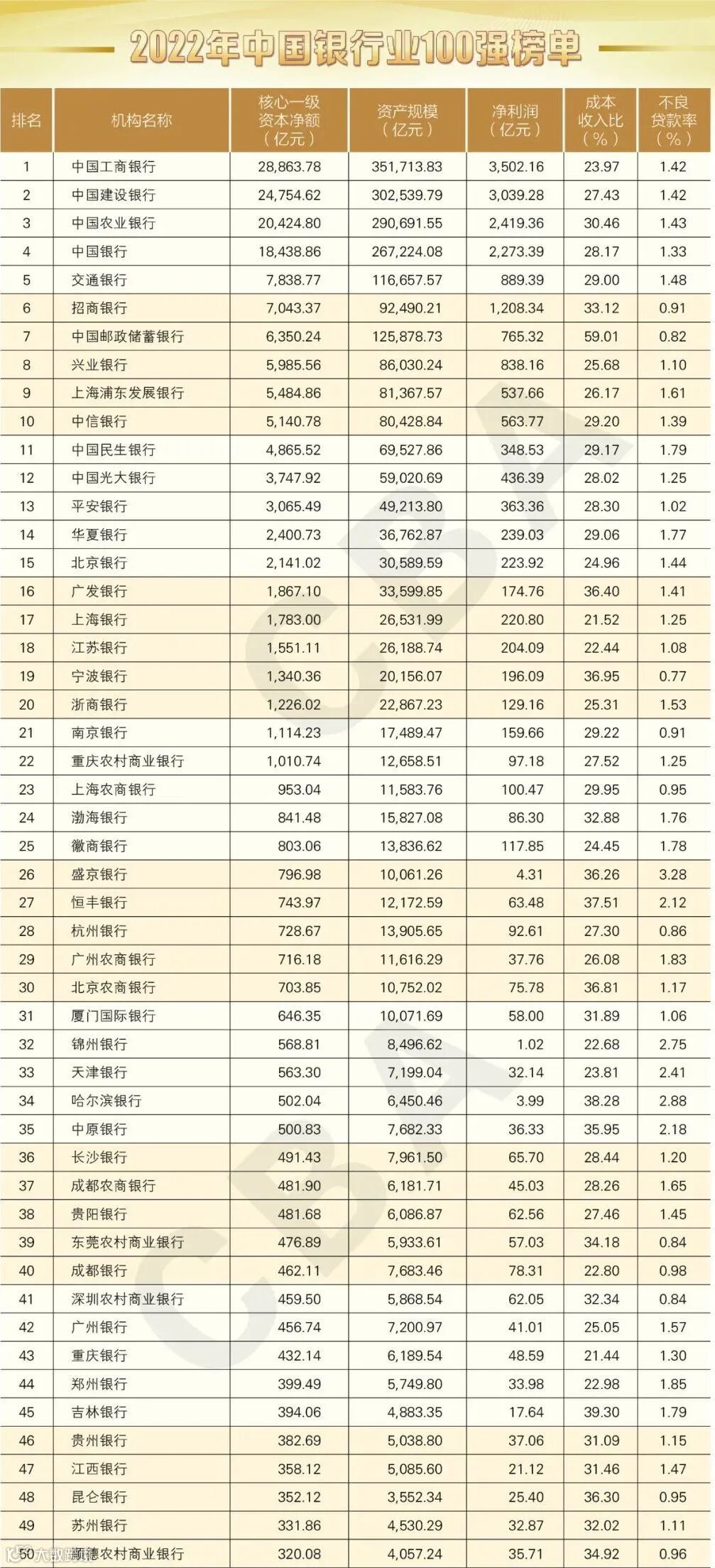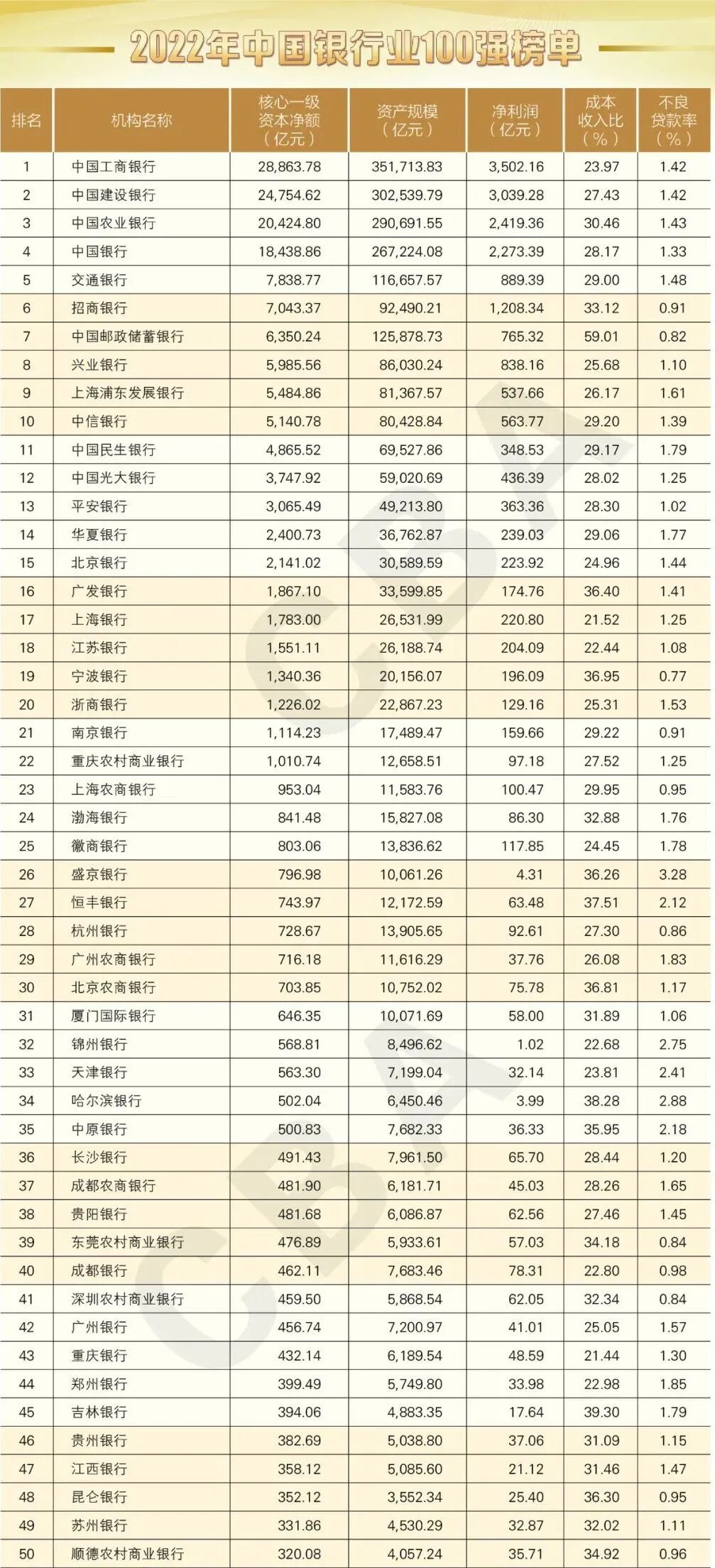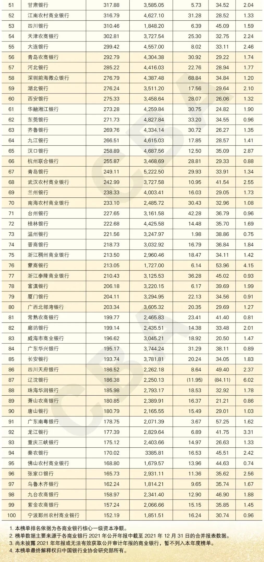 为推动银行业高质量发展,中国银行业协会连续七年发布“中国银行业100强榜单”。榜单遵循简单、客观、专业的原则,参考巴塞尔协议Ⅲ和监管机构相关要求,按核心一级资本净额排序,并对中国银行业前100家银行的经营规模、盈利能力、运营效率及资产质量进行综合展示。榜单数据主要来源于各商业银行公开年报,同时覆盖所有类型中资商业银行。2021年,上榜银行资产总和占商业银行总资产的89.67%,创造了商业银行96.84%的净利润,包括6家大型银行,12家股份制银行,60家城商行、21家农商行和1家民营银行。