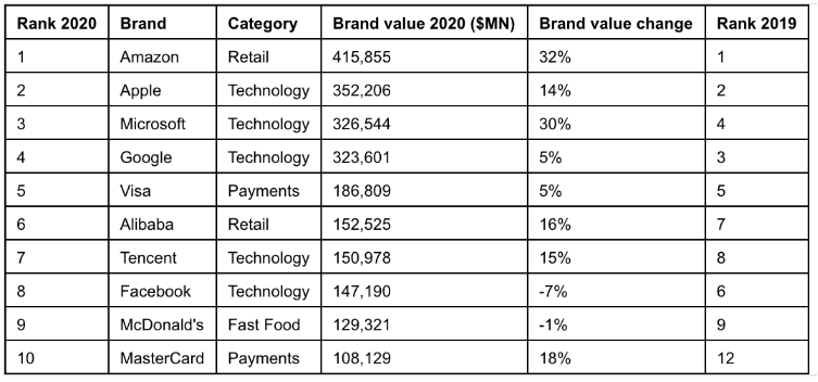 近日,Kantar和WPP发布的《2020年BrandZ全球最具价值品牌100强排行榜》显示,科技品牌仍在榜单中拔得头筹,总价值占据了前100名品牌三分之一的份额,并且整体增长了10%。科技巨头亚马逊(Amazon)再次占据榜单首位:其品牌价值飙升至4150亿美元,较2019年增长了32%。因为新冠疫情的原因加速了消费者网上购物的趋势,这家电子商务巨头的股价也在今年上涨了45%。