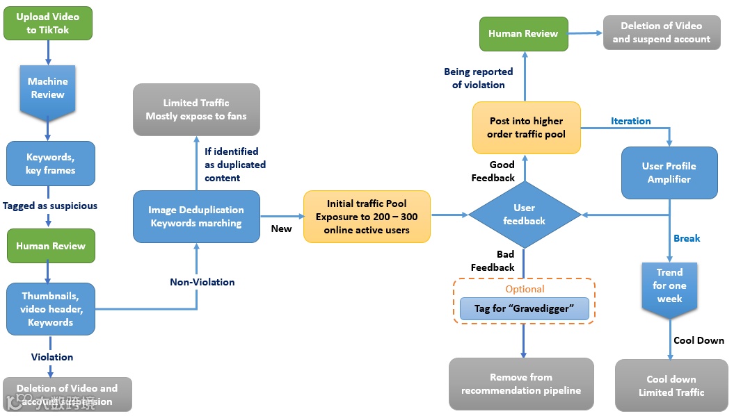 在可以量化的学习框架之外(如视频的参数,如点击率、观看视频的时间、点赞数量和评论等)搭建一个控制边界的框架,也就是我们所说的内容审核系统。