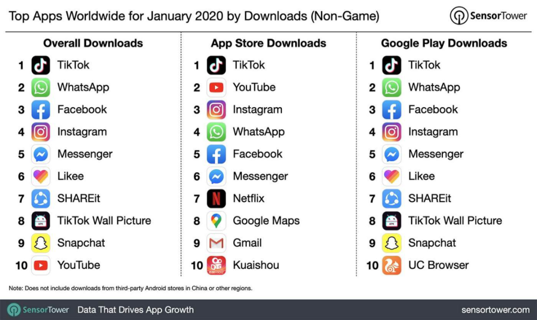 TikTok(抖音),这款看起来平平无奇的制作和分享短视频的应用程序,截止2020年1月,在AppStore和Google Play的下载量已经超过了20亿次。在非游戏类软件下载排行中,远远领先各大社交媒体和视频分享平台,如Facebook, Instagram和YouTube。