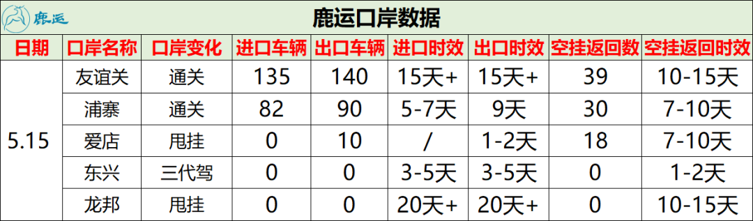 昨天,从越南返回友谊关的空挂车39辆,返回的是5月8日的,挂车返回时效需要10-15天。