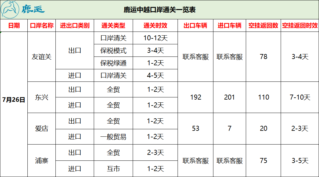 昨天,从越南返回友谊关的空挂车78辆,返回的是7月24日的,挂车返回时效需要3-4天。