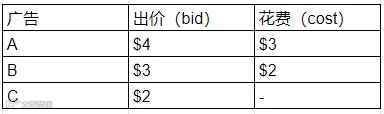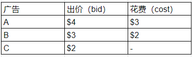 在上传广告Campaign之前,广告主都需要设置预算,也就是用户每次点击的出价,但这个出价并不一定是每次点击的最终花费。例如:A、B、C3个广告排名依次为1、2、3,那么就会有这种情况: