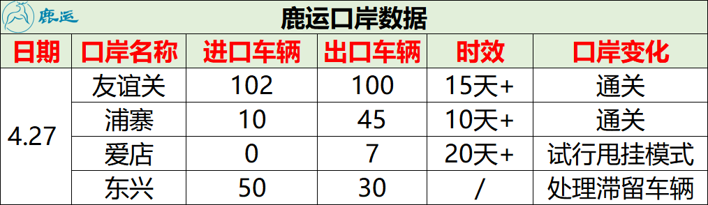 4月27日,浦寨进出车辆一共55辆,其中进口10辆,出口45辆。