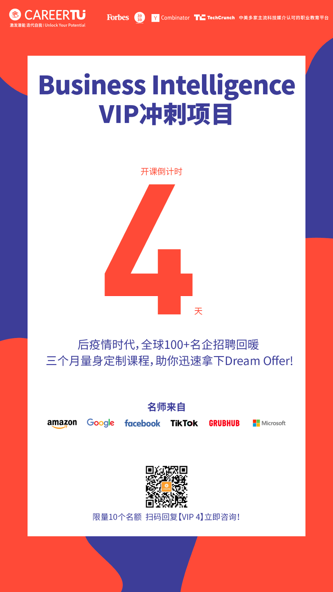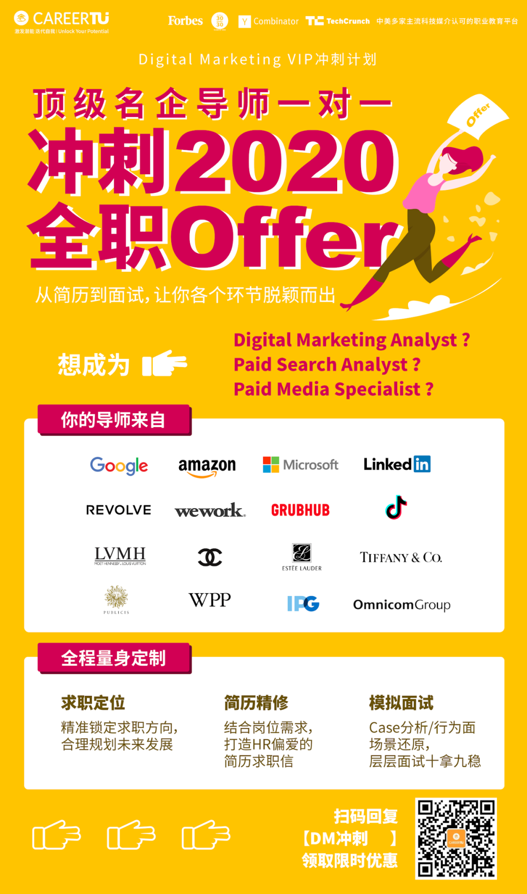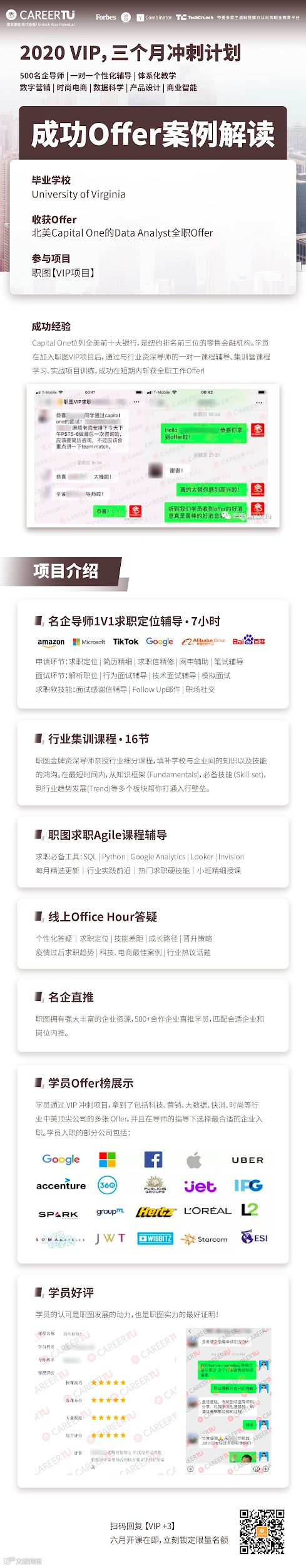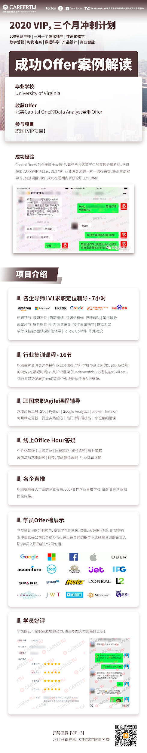 在过去的12个月,职图成功帮助同学们拿下了100+家公司的中美名企Offer,其中包括大量在疫情危机下成功云入职的案例。今夏全球招聘回暖,职图[金牌VIP冲刺课程]将在本月底全面来袭。三个月精心设计的课程助你在职场软、硬技能各方面快速提升,抓住这黄金3个月的时间,一举拿下心仪Offer。