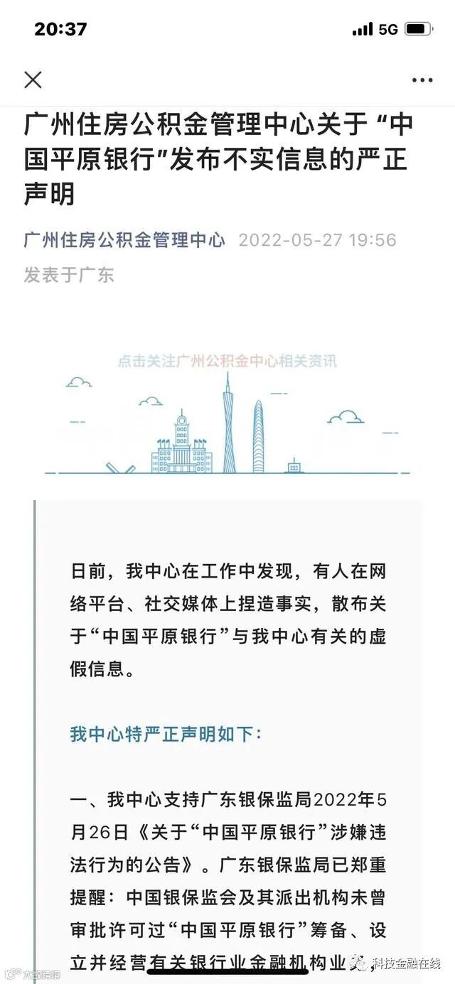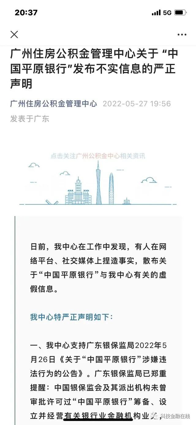 目前,广州住房公积金管理中心已发布声明,表示与“平原银行”从未开展任何形式的合作,办公地址也从未向“平原银行”开放使用,已就相关情况向公安机关报案。
