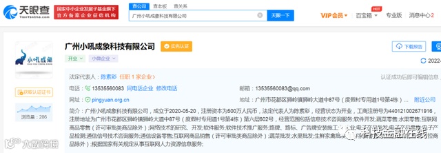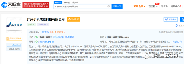 媒体调查发现,这些与“平原银行”相关的账号,其注册主体“广州小吼成象科技有限公司”是一家在2020年成立的小微企业。注册资本500万元,注册地址在广州市花都区狮岭镇狮岭大道中87号(度假村专用道1号第4栋)第六层602号,法定代表人是陈某彩。其所属行业为“软件和信息技术服务业”,经营范围则是“信息技术咨询服务、软件开发、蔬菜零售、水果零售”等内容,压根与银行没有半毛钱关系。