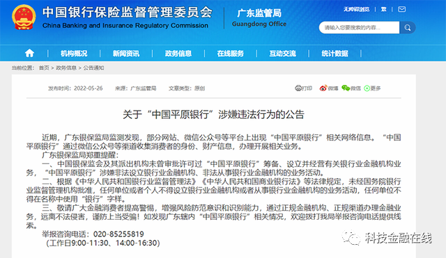 5月26日,广东银保监局发布《关于“中国平原银行”涉嫌违法行为的公告》,公告称,近期,监测发现,部分网站、微信公众号等平台上出现“中国平原银行”相关网络信息。对此,广东银保监局作出提醒称,中国银保监会及其派出机构未曾审批许可过“中国平原银行”筹备、设立并经营有关银行业金融机构业务,“中国平原银行”涉嫌非法设立银行业金融机构、非法从事银行业金融机构的业务活动。