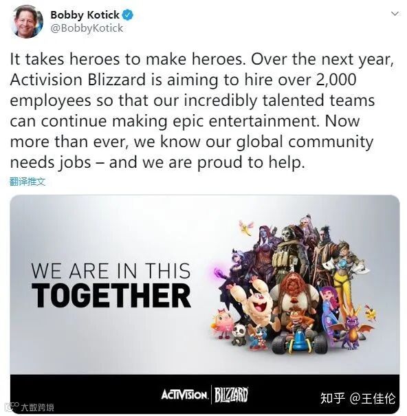 互联网行业受疫情影响相对较小,对人才需求更强。据猎聘的数据,互联网行业发布的新增职位占据全行业的32.27%,远高于其他行业。动视暴雪的首席执行官Bobby kotick近日更是发推表示,动视暴雪将于明年计划招募2000多名员工,致力于帮助团队打造出更多史诗级的游戏作品。