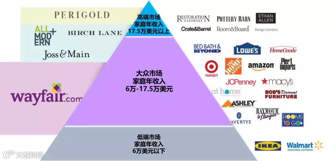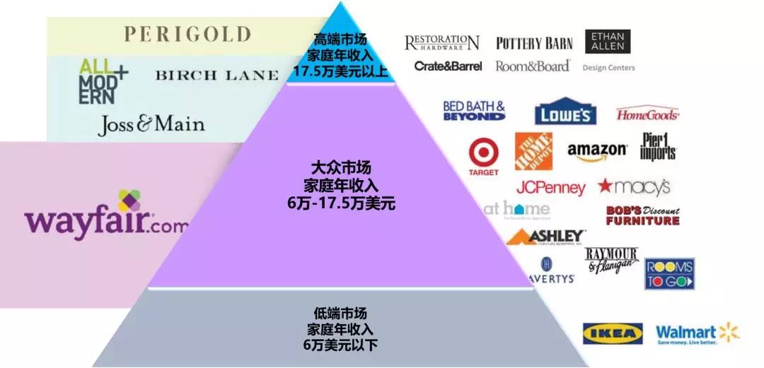 Wayfair之所以能实现业绩的快速增长,很大一部分原因是得益于它对用户的清晰定位。它将使用者分为三层,他们锁定的目标是中间的大众用户。这些用户是年龄层35到65岁的女性消费者,家庭收入在6万至25万美元之间。旗下五个品牌针对不同层次用户的需求,提供个性化的产品服务。