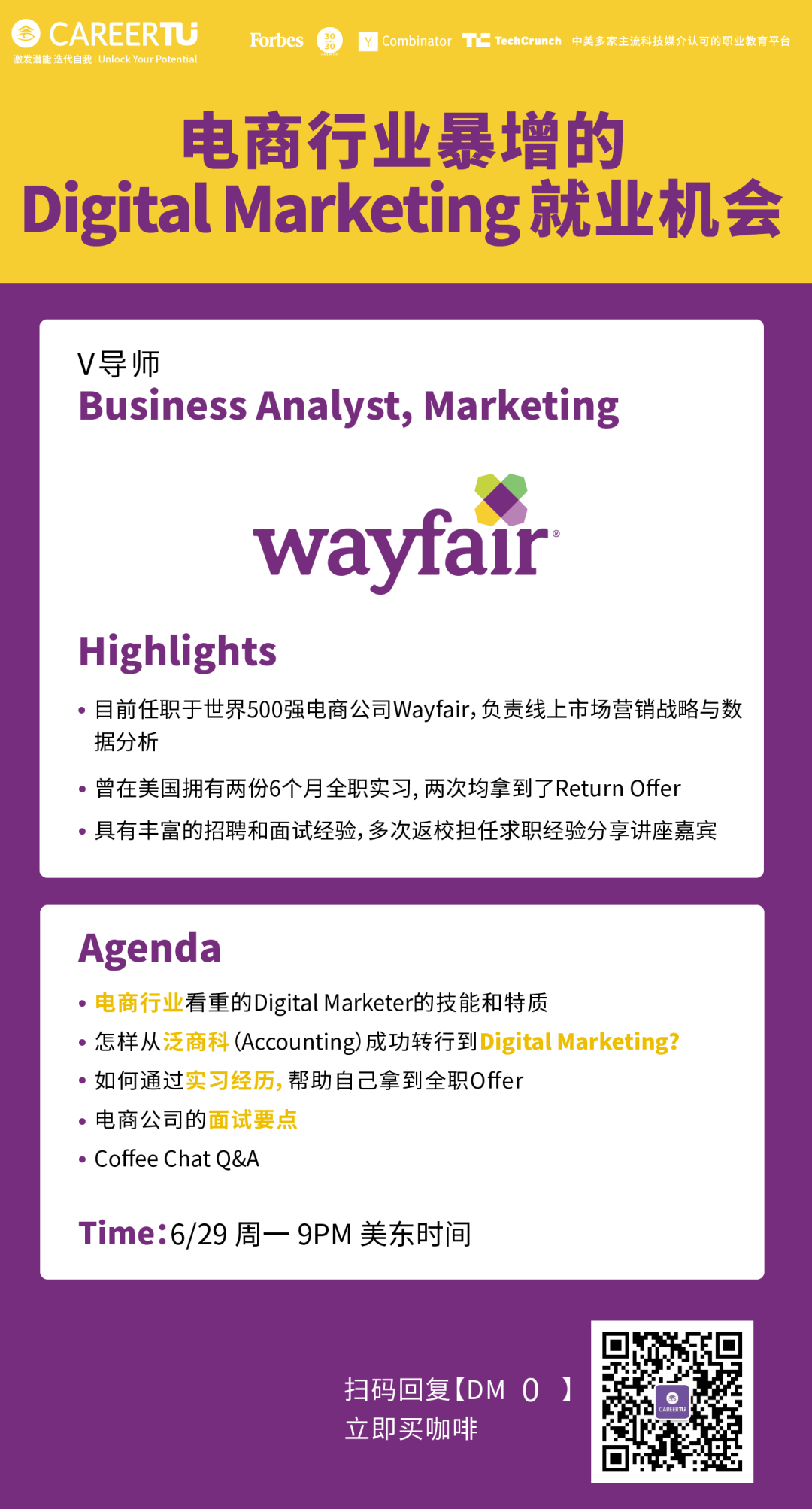 6月29日,我们请到了来自Wayfair的资深商业分析师(Business Analyst,Marketing), 为你讲述就职于事解500强电商公司的她,是如何从泛商科成功转行到Digital Marketing的;她的日常工作范畴,以及如何通过数据分析来改善客户体验,并提升营销效果。