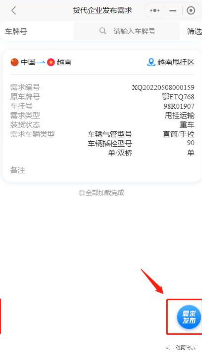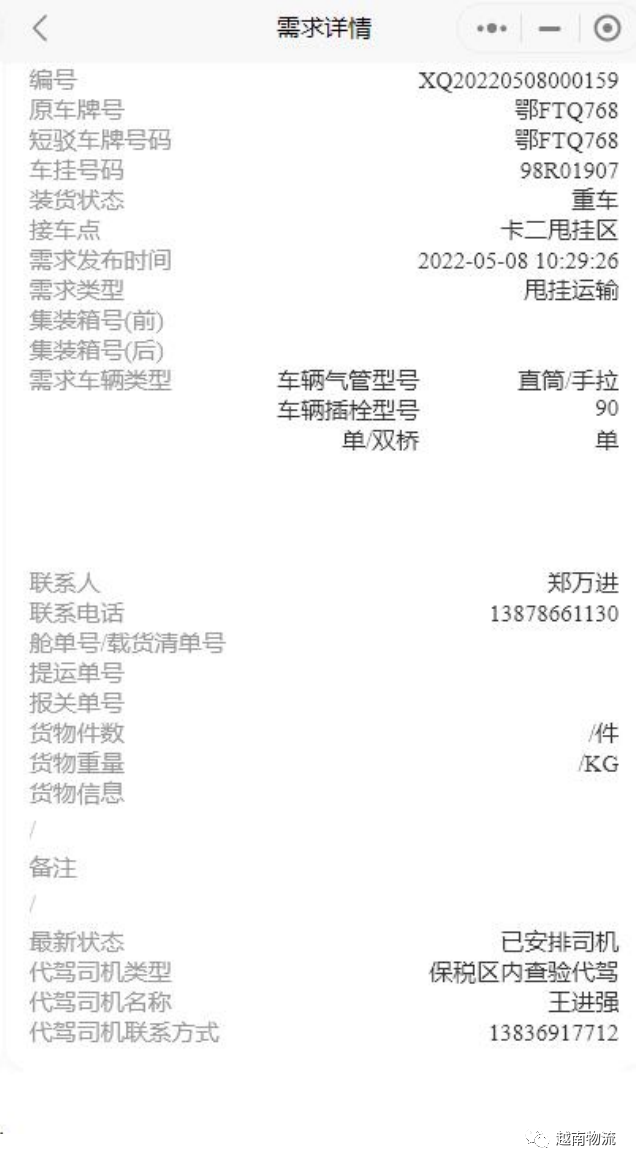 需求发布后客服会进行信息审核,审核通过后进入作 业流程列表,系统会安排短驳车辆和代驾司机,货代企业 如需了解最新进展情况可以点击详细,查询最新进展情况: