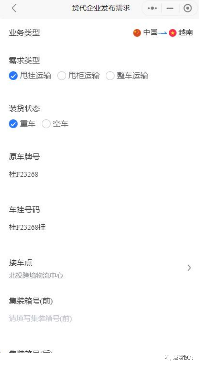 系统收到回填接货时间和地点的需求单后安排车辆去 越南甩挂区接货。