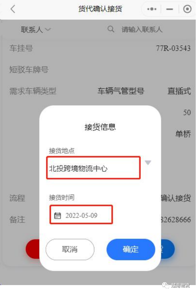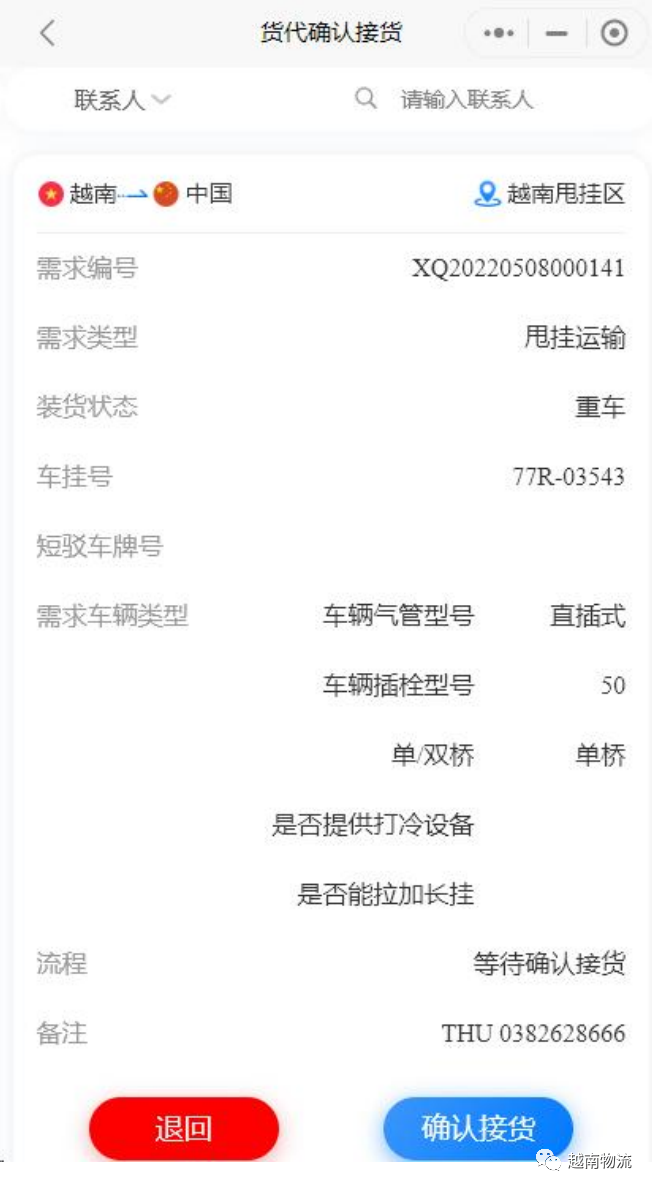 进口货物到达越南甩挂区后,由客服发布进口需求信 息,中国货代用户进入“进口接货确认”功能查阅明细, 选择需求单,确认接货时间和地点。