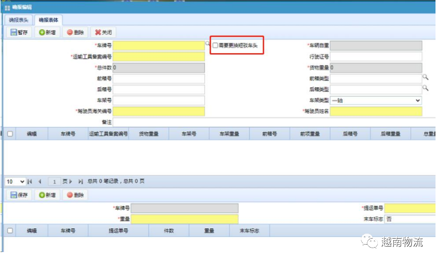 为解决短驳车辆舱单确报信息的申报,系统在舱单确 报页面增加了 “需要更换短驳车头”的选择项,勾选后 企业只需要维护好除车牌号码、车头重量之外的信息,系 统会根据舱单/载货清单对应的原车牌和短驳车牌对应关系进行替换后自动申报。