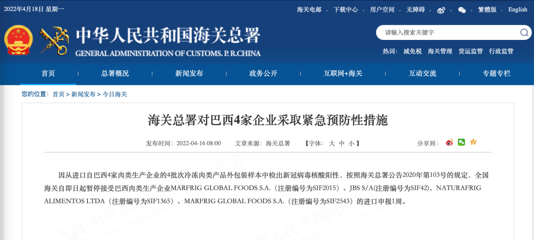 4月16日,进口自巴西4家肉类生产企业的4批次冷冻肉类产品外包装样本中检出新冠病毒核酸阳性,全国海关自即日起暂停接受巴西肉类生产企业MARFRIG GLOBAL FOODS S.A.(注册编号为SIF2015)、JBS S/A(注册编号为SIF42)、NATURAFRIG ALIMENTOS LTDA(注册编号为SIF1365)、MARFRIG GLOBAL FOODS S.A.(注册编号为SIF2543)的进口申报1周。