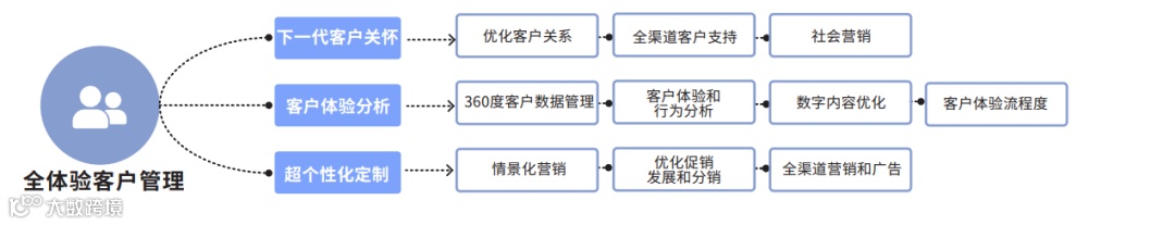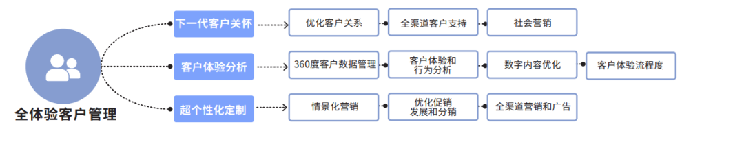 1. 全体验客⼾管理(Omni-Experience Customer Engagement)。通过线上、线下、电话、多媒体等全渠道与客户发生交流并着力于提升客户感受,给予消费者及时的客户支持。客户体验分析与超个性化定制:通过对于客户数据的采集分析出消费者偏好,并向其推送定制化、场景化的产品 ,实现大规模个性化定制生产,以此来提高消费者粘性和复购率。