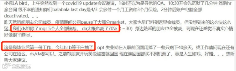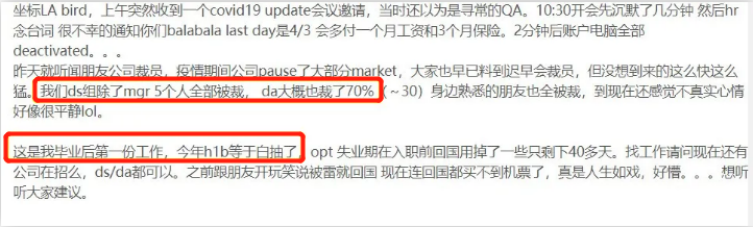 甚至也有刚进入大厂核心部门的同学,在开早会时突然被告知裁员。