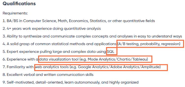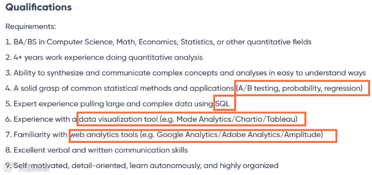 如字节近期热招的Data Analyst岗位的JD上明确指出,需要申请人掌握过硬的SQL技能、Web analytics tools以及Data visualization tools: