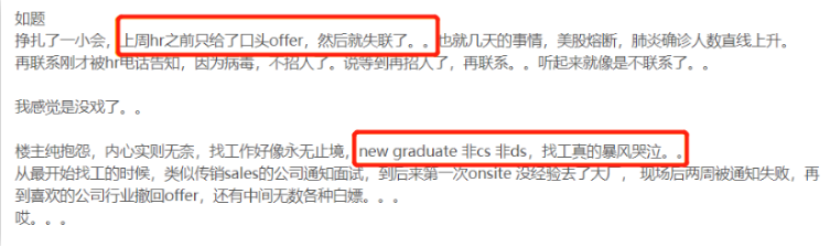但是因为疫情的影响,全美各行业出现了大量企业岗位停止招聘、面试推迟,也有很多同学遇到口头Offer被撤回的情况。尤其是实习生和初入职场的新人,经验少、培训成本高,如果又处于基础岗位,被撤销Offer或裁员的几率很大。