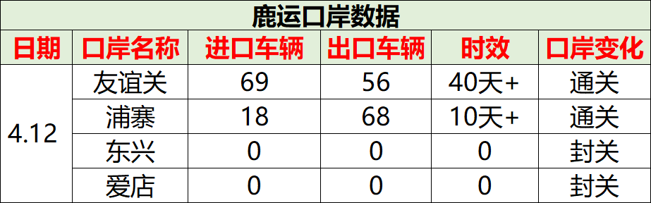 友谊关口岸:4月12号,凭祥进出境车辆一共125辆,其中进口69辆,出口56辆。凭祥友谊关继续实行甩挂模式,目前系统排队车辆总数934辆,系统车辆最新放行还是2月20号的车辆,其他时间的车辆还需要排队放行。