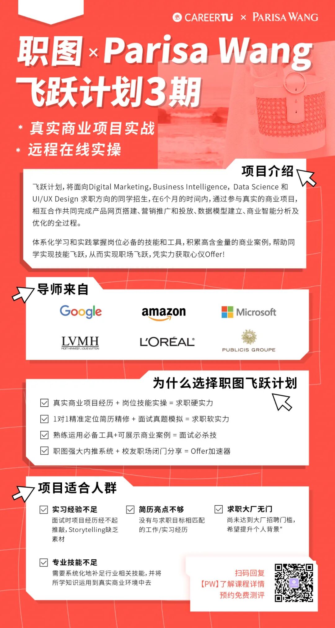 职图今年推出的飞跃计划,面向Digital Marketing、UIUX Design和Business Intelligence,Data Science四个求职方向的同学招生!参加计划的学员在6个月的时间内,通过参与真实的商业项目,相互合作共同完成职图×Parisa Wang联名款产品网页搭建、营销推广和投放、商业智能分析及数据分析、优化的全过程。