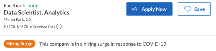 例如,Facebook在著名求职网站Glassdoor中的状态被标记为“Hiring Surge“,即正在大规模招聘中。