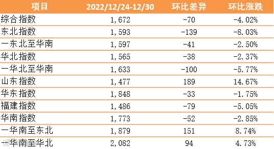 此外,山东指数报收1477点,环比上涨189点,增幅14.67%;华东指数报收1848点,环比下跌33点,跌幅1.75%;福建指数报收1486点,环比下跌79点,跌幅5.05%。