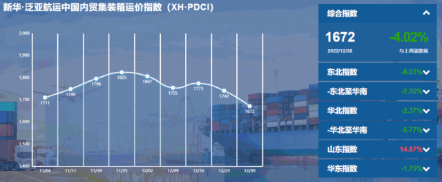 核心提示:国内市场需求小幅回落,当期报告(2022.12.24-12.30)新华·泛亚航运中国内贸集装箱运价指数报1672点,较上期(2022.12.17-12.23)环比下跌70点,降幅4.02%;同比下跌205点,降幅10.92%;6个区域子指数一涨五跌,4条流向指数两涨两跌。