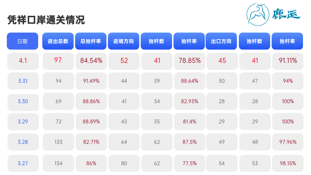 凭祥目前系统排队车辆总数1412辆,最新放行的是时间还是2.20号的车辆,其他时间的车辆还需要排队放行。截止到4.1号,进出境车辆一共97辆,其中进境52辆,出境45辆,近几天数据,逐渐上升,趋势稳定。