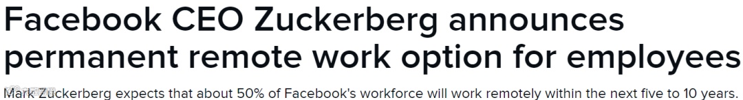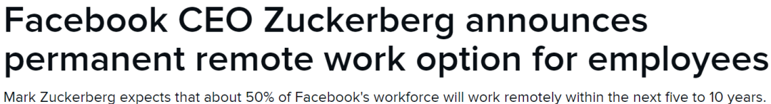 今日,Facebook首席执行官马克·扎克伯格表示,Facebook将允许永久性的远程工作,并积极开放”远程招聘”。扎克伯格预计,未来5到10年内,Facebook约50%的员工将进行远程办公。