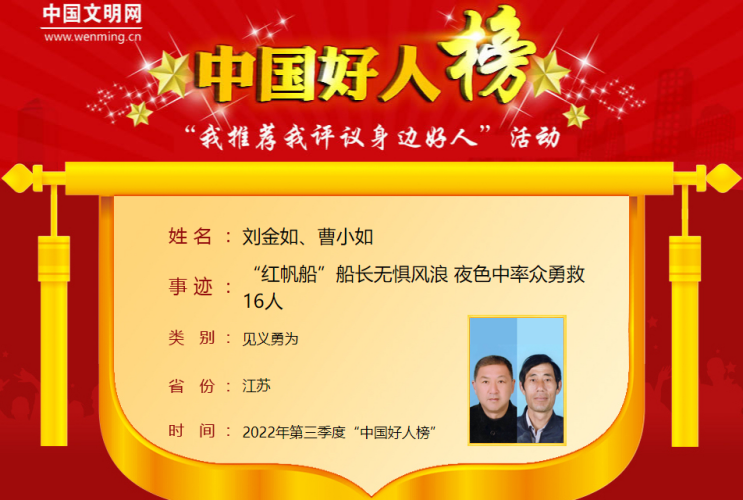 2022年第三季度“中国好人榜”于11月18日上午发布,江苏省南通市“红帆船”船长刘金如、曹小如当选。