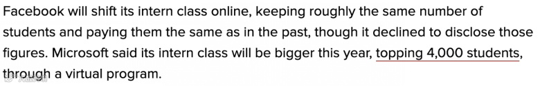 苹果公司今年将继续为1000+学生提供暑期现场或虚拟实习项目;Facebook将会保留同样数量的暑期实习岗位并将其移至线上;