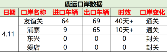 浦寨口岸:4月11号,浦寨进出车辆一共74辆,其中进口9辆,出口65辆。越南空车无法到中国接货,重车可以,中国装货的挂车司机可以开中国车到浦寨监管区换短驳车头拉中国挂到越南清新货场甩挂接驳,或者短驳车头拉越南在中国的空挂带货回越南甩挂接驳。(甩挂模式)