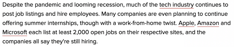 美国主流技术及电子媒体网站C|Net五月份发布的文章中表示许多大公司都将在暑假继续提供暑期实习机会 :苹果、亚马逊、微软都在网站上列出了至少2000个空缺岗位。