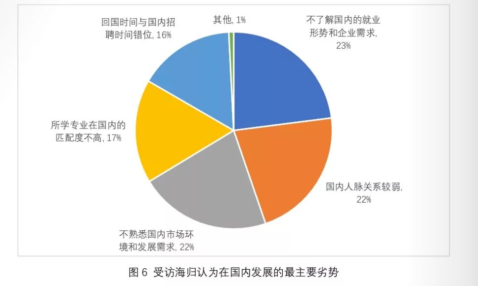 报告还显示“具有国际视野”、“语言沟通能力强”是海归在国内就业的最主要优势。而在海归回国就业劣势的问题上:23%的海归选择“不了解国内的就业形势和企业需求”,22%选择“国内人脉关系较弱”,22%选择“不熟悉国内市场环境发展和发展需求”,17%选择“所学专业在国内的匹配度不高”。
