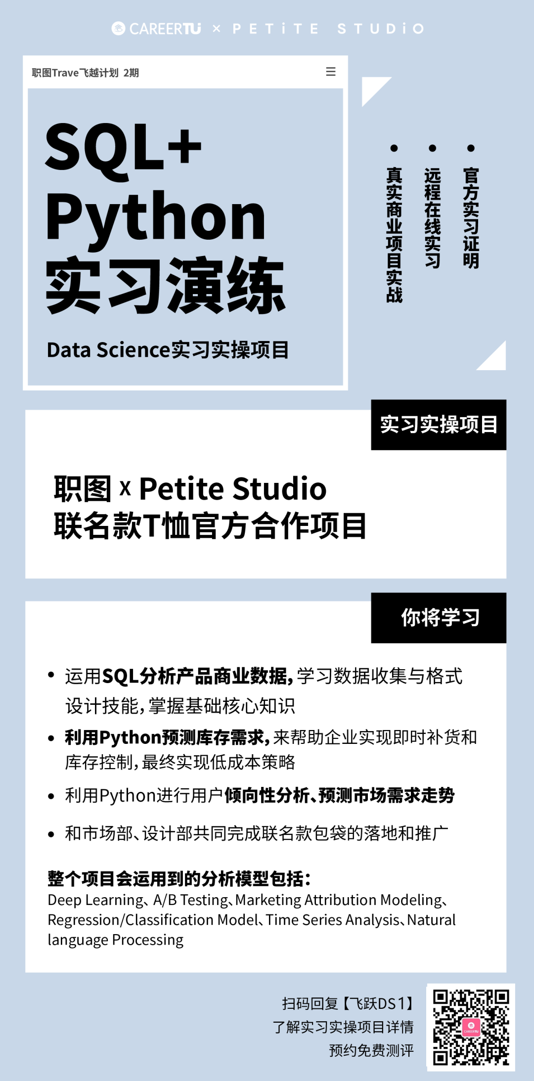 已经摩拳擦掌,跃跃欲试开始准备作品集,却苦于找不到数据,或不知道做什么项目?职图的Petite Studio飞跃计划,则为同学们提供了难得的项目实战机会。给你一段高含金量远程实习,足不出户跟随一线名企导师巩固数据分析相关技能,做出面试官满意的数据科学作品集!