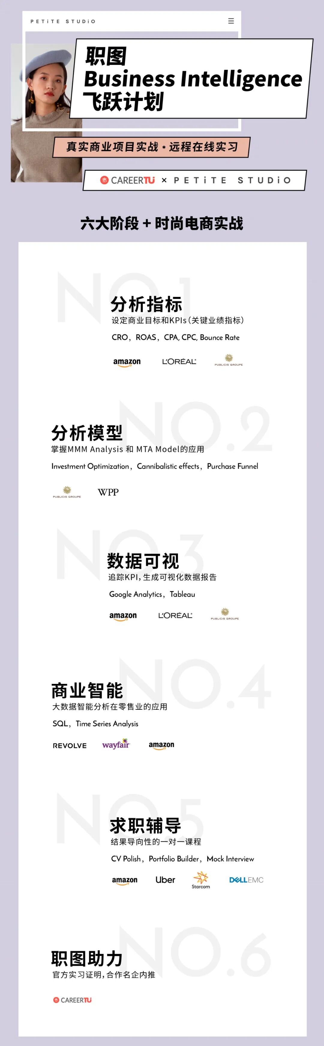 不打杂、有实操。你不是打杂的小人物,而这个商业项目的主心骨!并与不同职能的同学协作,我们将以产品增长团队为原型,成立职图 X Petite Studio联名款合作事业部,Digital Marketer,UIUX Designer,Data Science 以及 Business Intelligence Analyst将共同合作完成产品的落地和增长。