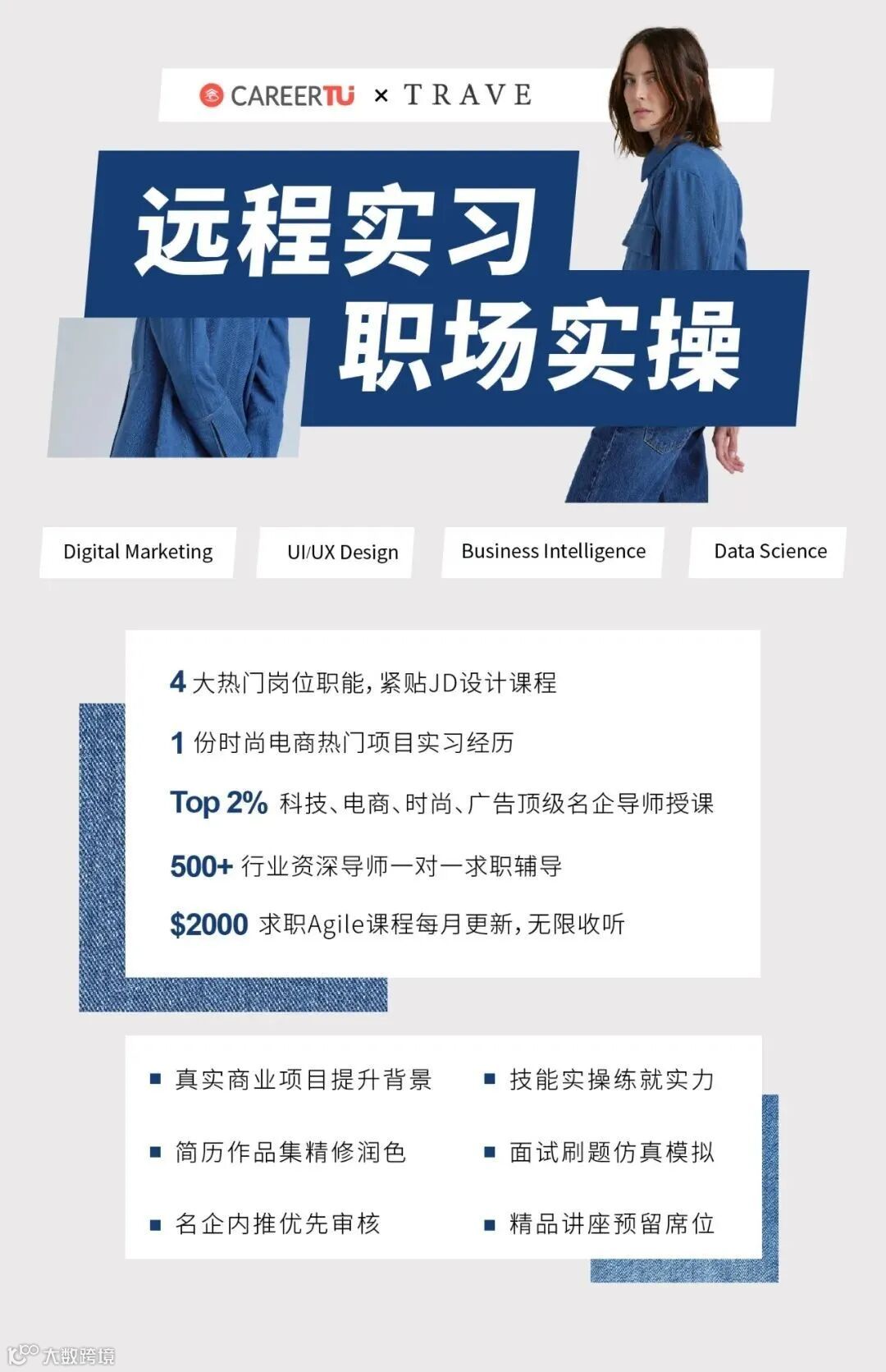 职图将与加州设计师品牌Trave合作推出飞跃计划专项,在全球范围内招收Digital Marketing, Business Intelligence, Data Science以及UI/UX Design四大方向的同学共同参与到联名款牛仔裤项目中,帮助同学们获得实际项目推广、落地、优化的全过程实操经验。