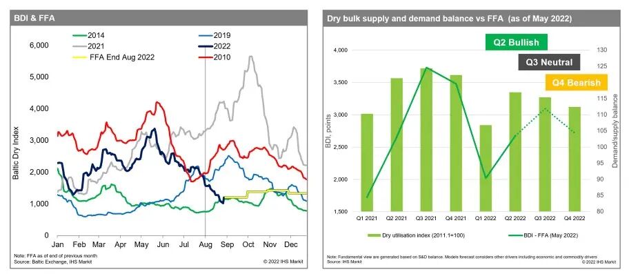 干散货航运收益在2022年第三季度初短暂反弹后,已连续3个月下降。根据市场的季节性趋势,干散货运价应在2022年第三季度达到峰值。