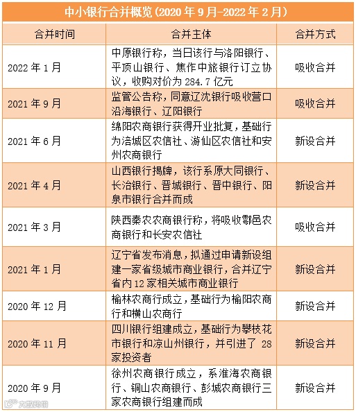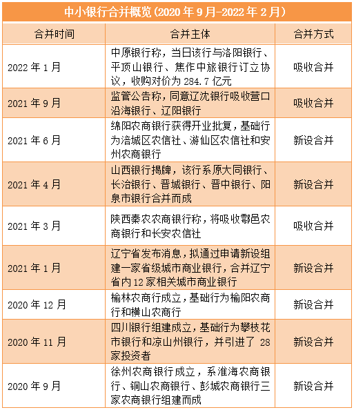 除了城商行之外,农商行和村镇银行也多有合并动作发生。例如,2021年7月,在绵阳市涪城区农村信用合作联社、绵阳市游仙区农村信用合作联社和四川安州农商银行的基础上,新设合并组建绵阳农商银行。2020年7月,陕西银保监局批复陕西榆林榆阳农商行和陕西横山农商行以新设合并的方式发起设立陕西榆林农商行等。
