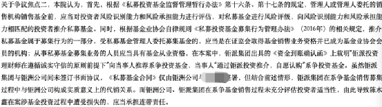 而有媒体也援引法律界人士的话说,钜派参与了基金的推销,属于代销行为,在没有对投资者进行适当性匹配,也没有确认其属于合格投资者的情况下,就推介了有关私募基金,未尽到适当性义务。宣传推介产品即为销售,而本案证据可证明,钜派投资推介了有关私募基金产品。虽然钜派投资与基金管理人钜洲公司之间未签订书面协议,但钜派投资在基金销售募集过程中与钜洲公司构成实质意义上的代销关系。且钜派投资是销售者,在销售涉案私募基金过程中,未充分尽到向投资者揭示投资风险的义务。而且,有关私募基金实际上就是由钜派投资进行管理的,但这一信息,却从没有向投资者披露。