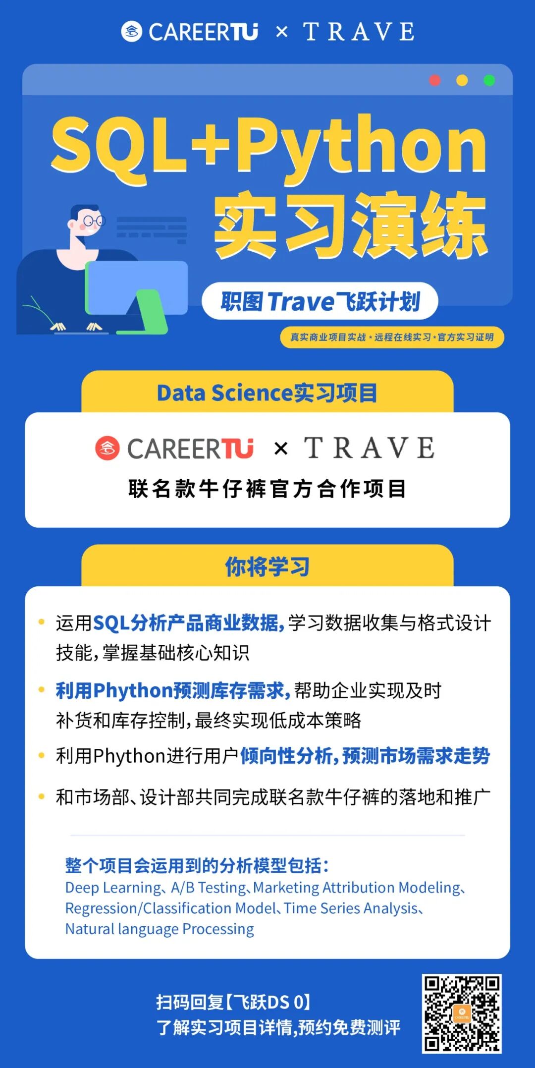 对于正在找实习、找全职工作的未来数据科学家来说,学习这些技能最好的方法就是付诸于实践。学校所教授的理论知识与真实的商业项目之间,存在巨大的鸿沟,不进入职场,你永远无法将技能应用于实践、并获得真实产出。职图整理了大量的数据分析相关岗位JD后,根据职场中最常用、最核心的技能,对数据分析方向的课程进行全面升级,并于时尚品牌Trave合作,推出了全新的“飞跃计划”课程!